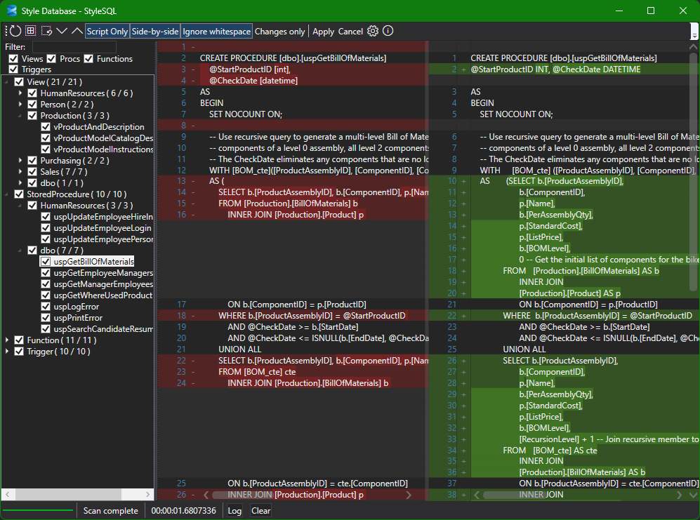 Run once to reformat stored procedures, views, and functions across a database with a review step before you save.